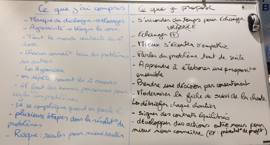 Aidé par Yannis Camus (Alterego Coopération) qui a proposé plusieurs temps d’animations différentes, quelques membres de la commission ont joué une scénette de « vie de chantier » qui a servi de base d’échanges entre les participants.