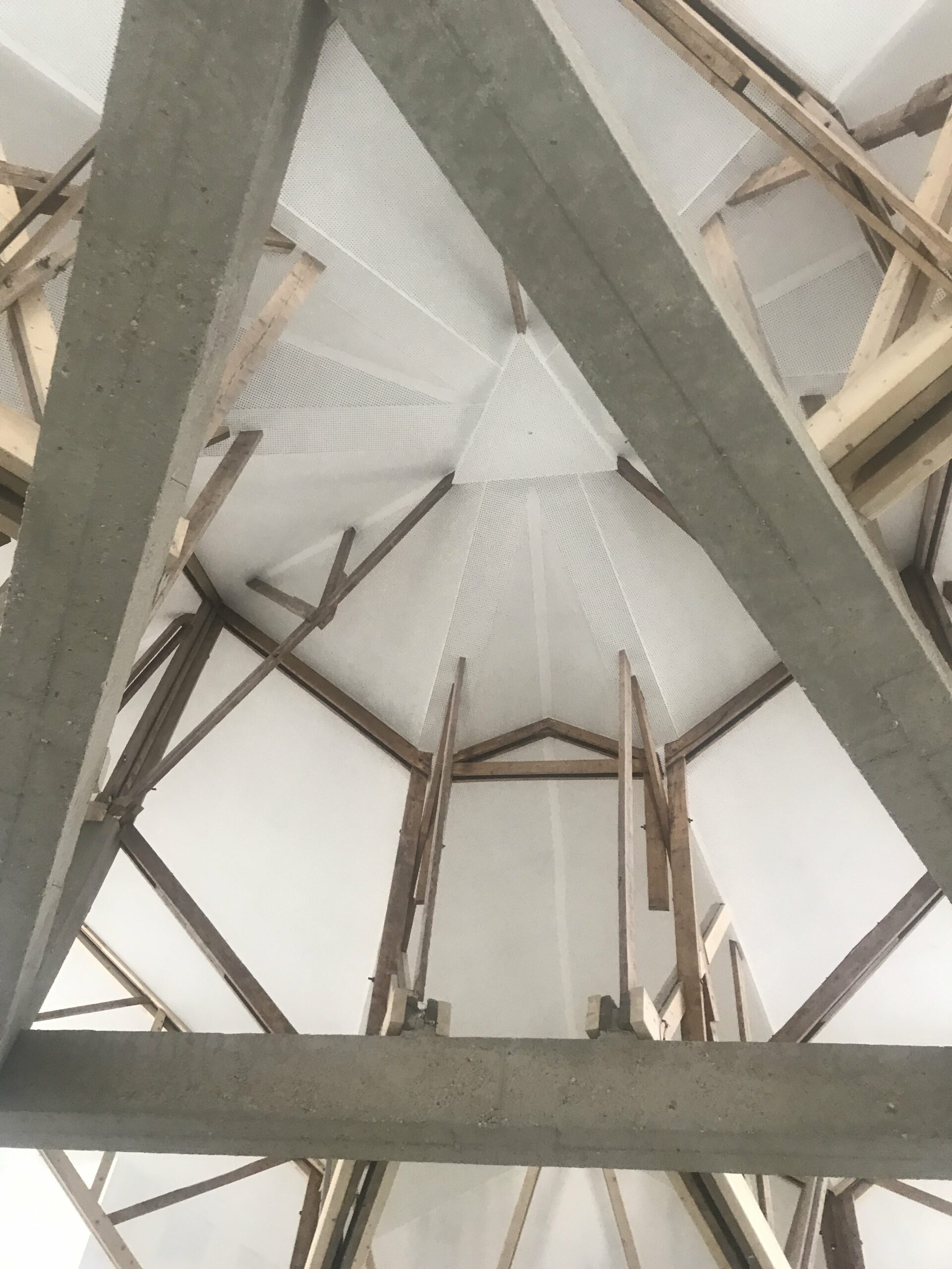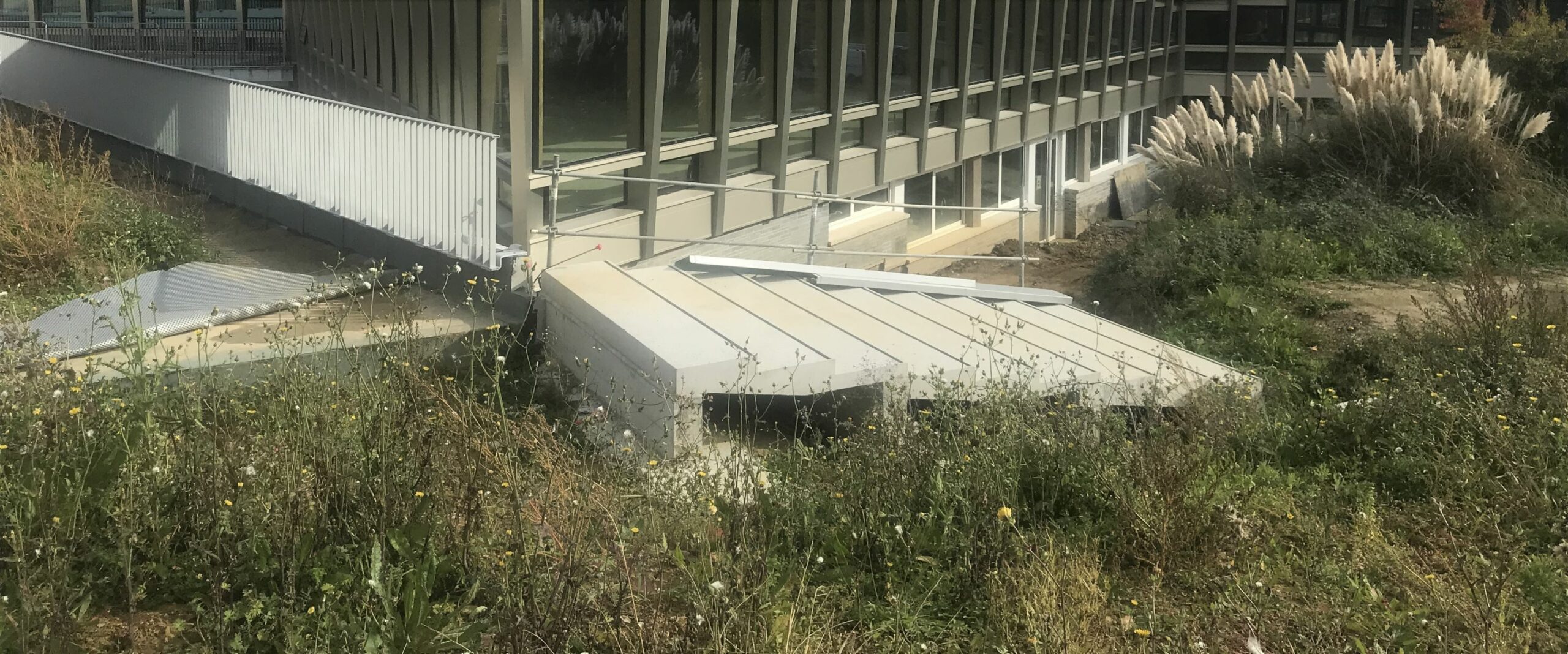 Positionnée en limite Nord et à l’Est de la parcelle, l’unité centrale de production alimentaire, enveloppe le bâtiment initial, et permet de ménager des vides ou des cours de desserte, de séparer les flux personnels / publics. Le fonctionnement intérieur a été pensé pour respecter toutes les contraintes du programme dans le respect des règles sanitaires et de marche en avant. Ce bâtiment a été imaginé comme un mouvement de terre venant entourer l’étoile pour mieux mettre en valeur l’élancement de ses multiples branches. Praticable, il devient un jardin et, au Nord, une extension des espaces de consommations.